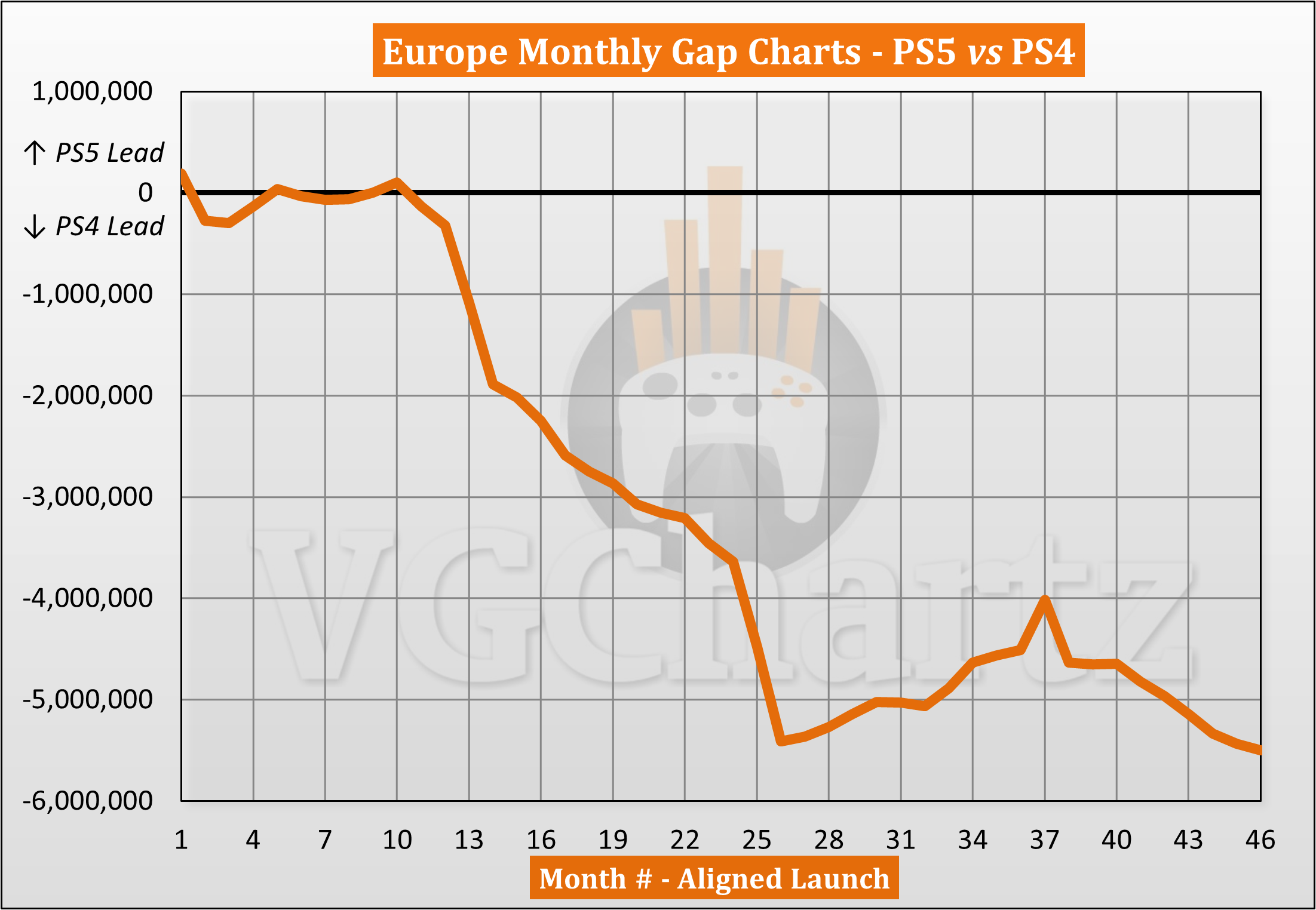 This monthly series compares the aligned Europe sales of the PlayStation 5 and PlayStation 4.