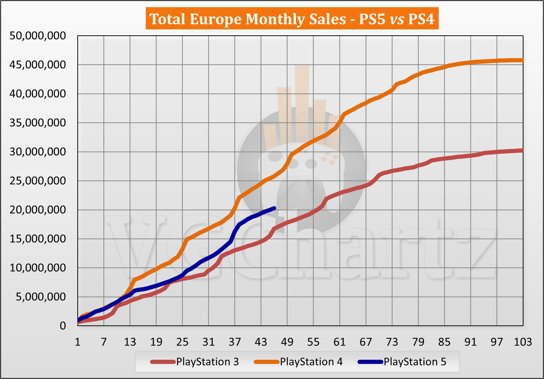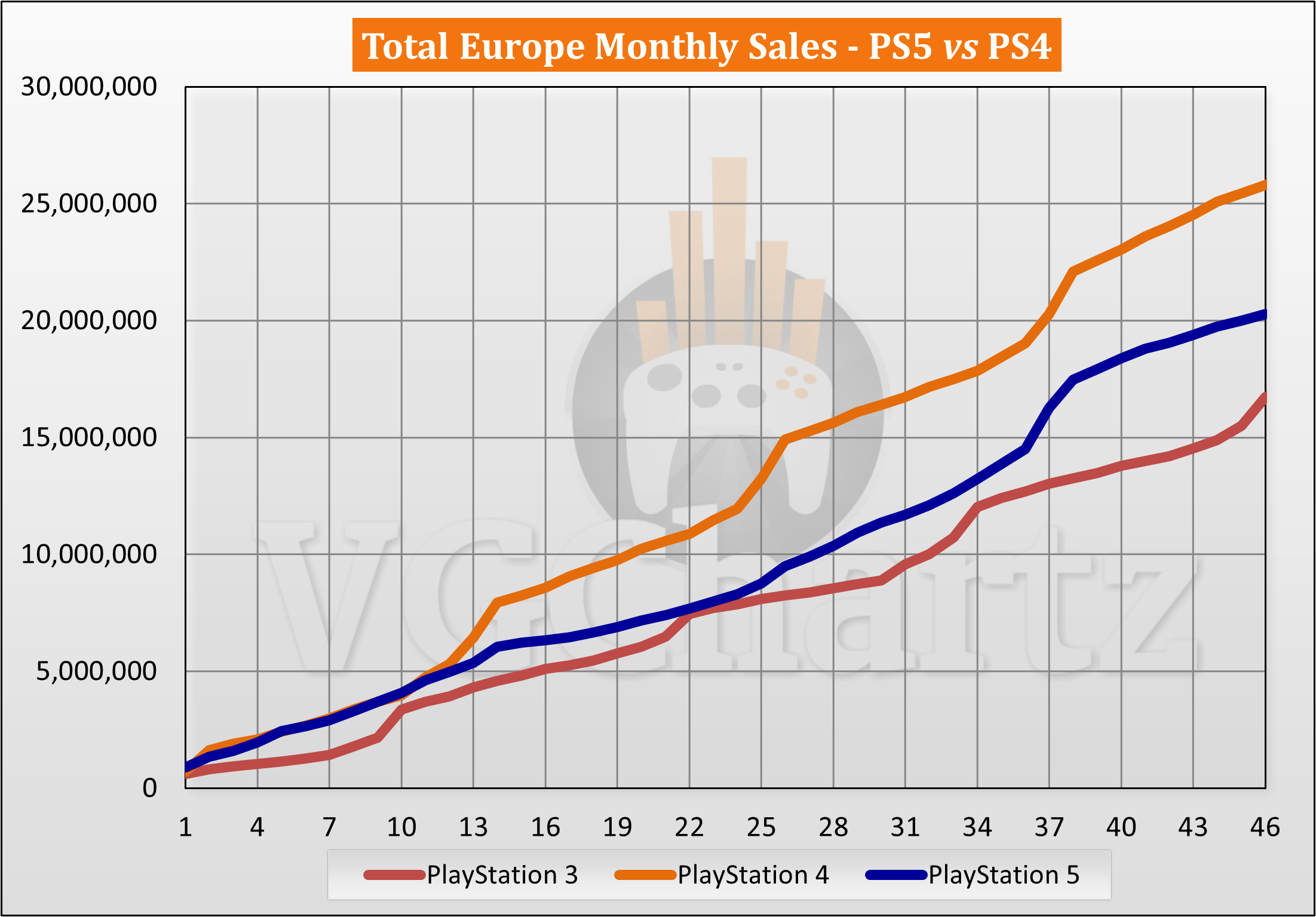 The PS4 crossed 30 million in month 51 and 40 million in month 72. The PS4 has sold 45.86 million units to date in Europe. The PS5 is 25.57 million units behind lifetime PS4 sales in Europe.