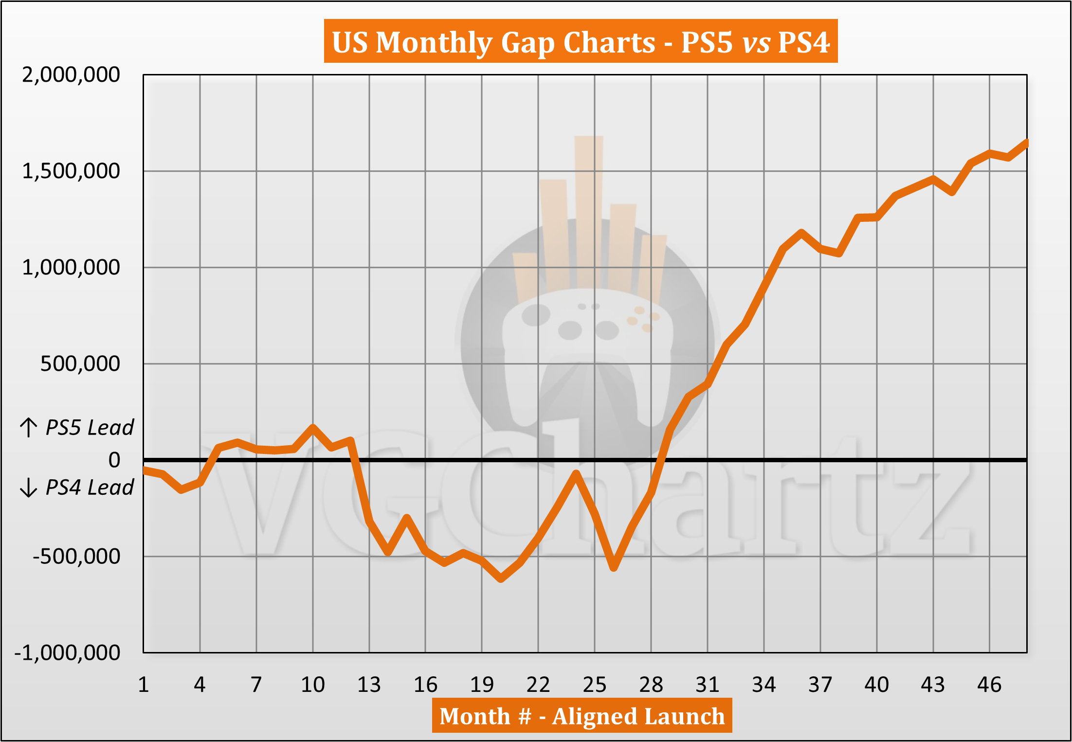 In the last 12 months, the PS5 has outsold the PS4 by 0.47 million units. The PS5 is currently ahead of the PS4 by 1.65 million units.
