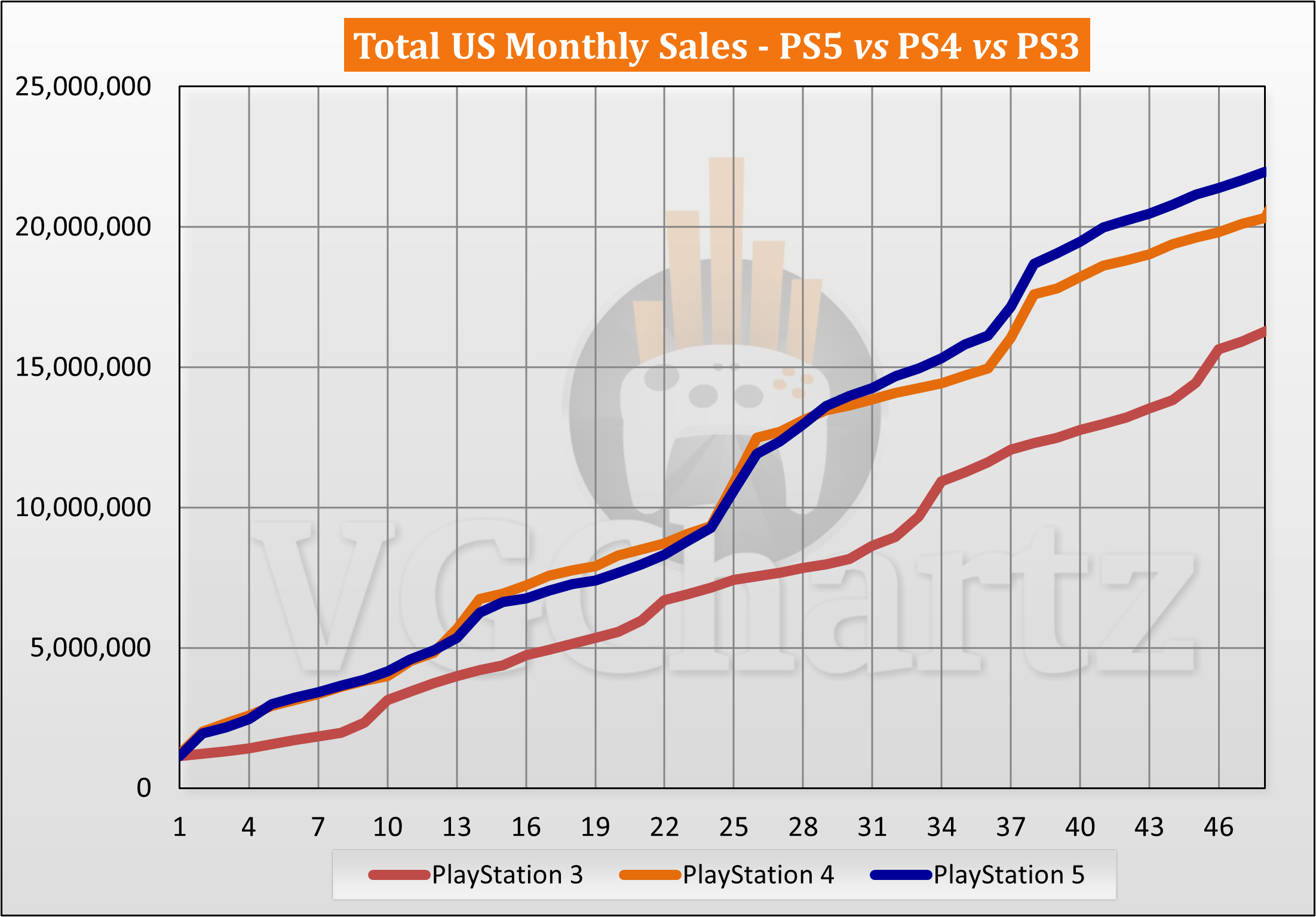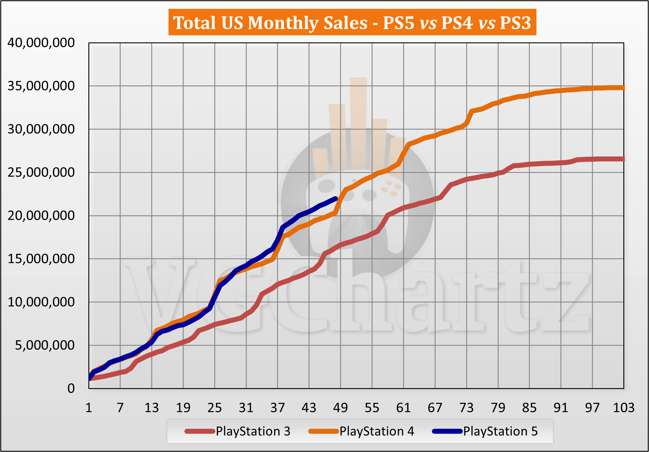 The PS4 crossed 25 million in month 57 and 30 million in month 71. The PS4 has sold 34.92 million units to date in the US. The PS5 is 12.95 million units behind lifetime PS4 sales in the US.