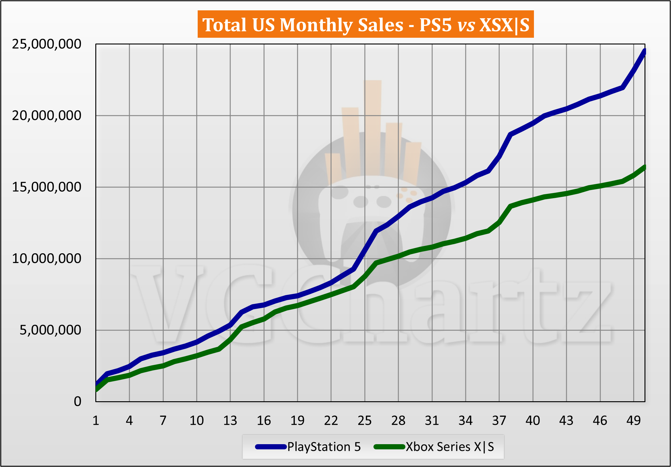 This monthly series compares the aligned US sales of the PlayStation 5 and Xbox Series X|S.