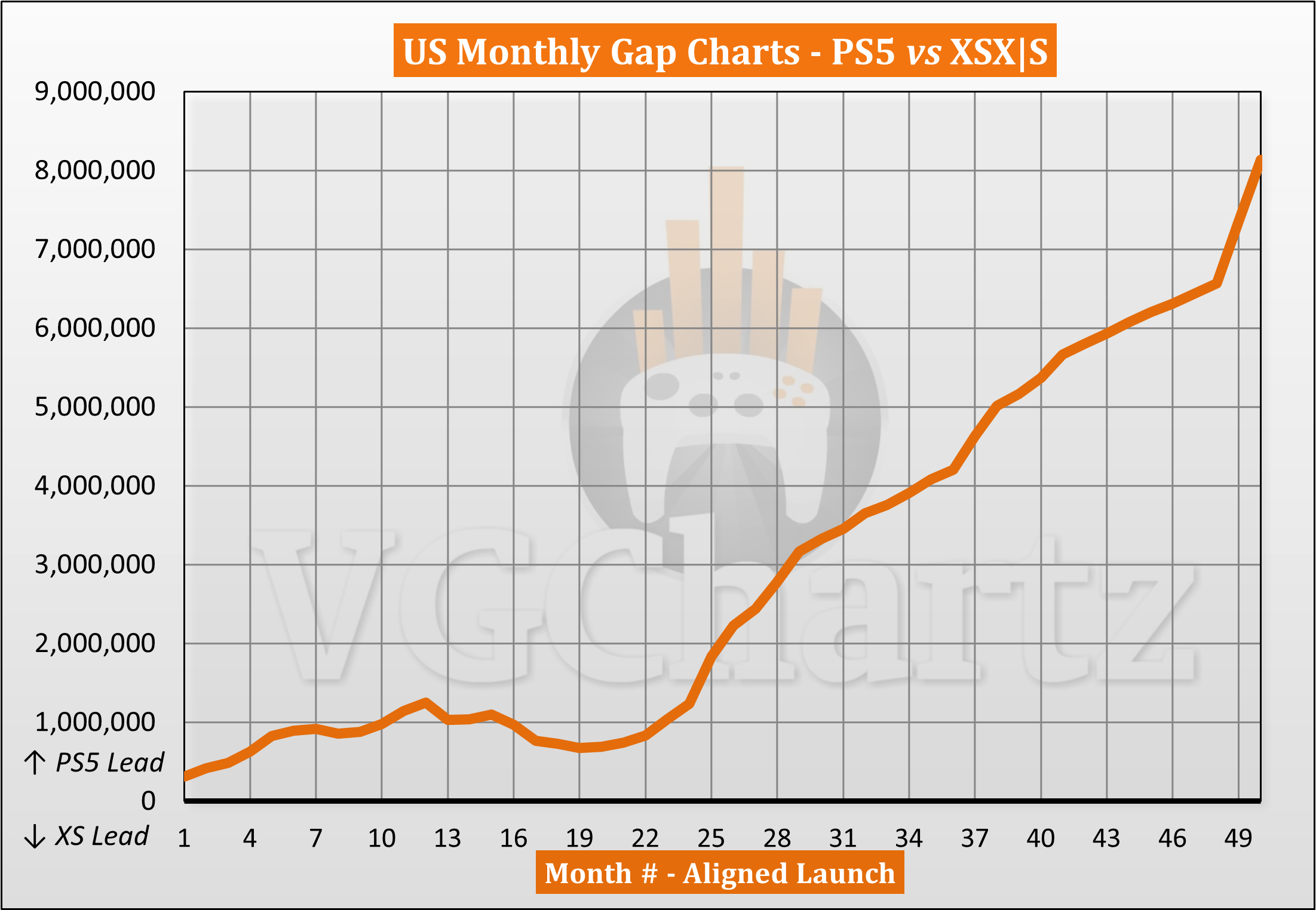 "The PlayStation 5 is currently 1.51 million units ahead the PlayStation 4 in the US when you align launches, while the Xbox Series X|S is behind the Xbox One by 3.93 million."