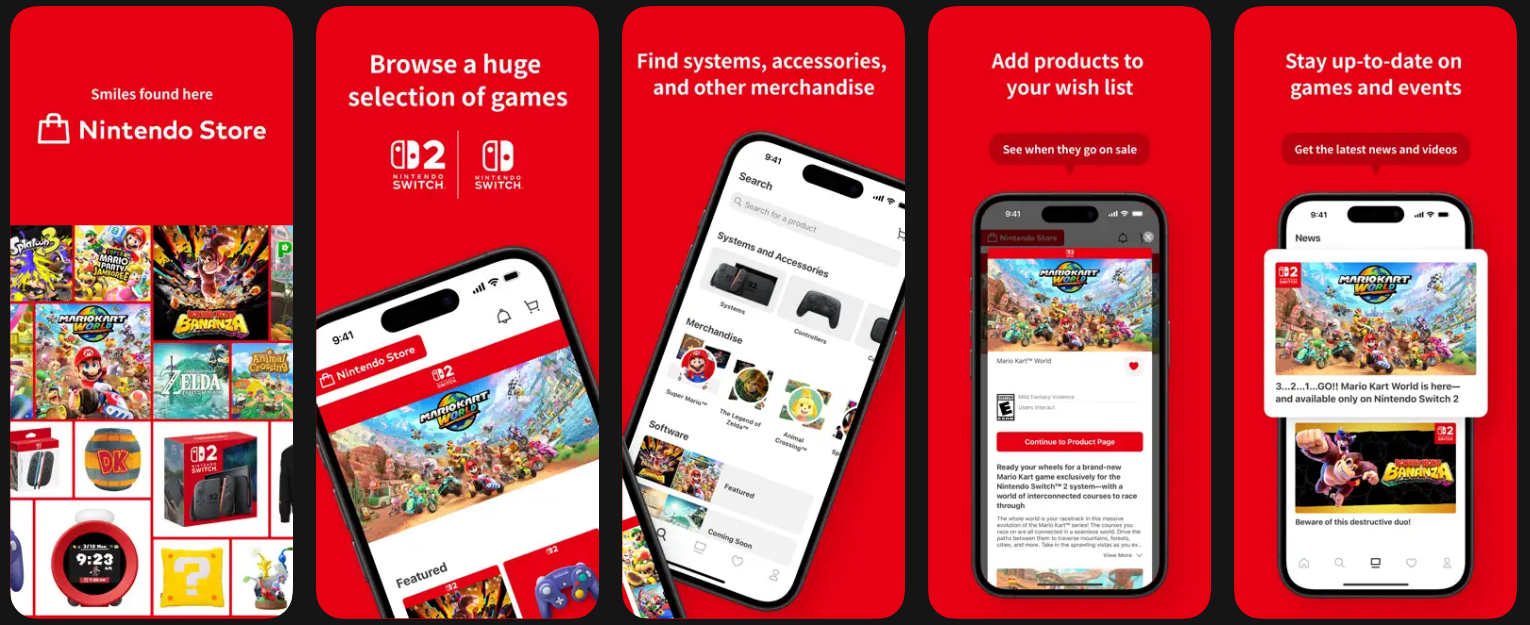 You can use this app to browse Nintendo Switch 2 / Nintendo Switch systems and accessories, physical and digital games, and other Nintendo products and merchandise—and then jump directly to My Nintendo Store to make purchases. (Note: Physical products are not available in all countries / regions.)