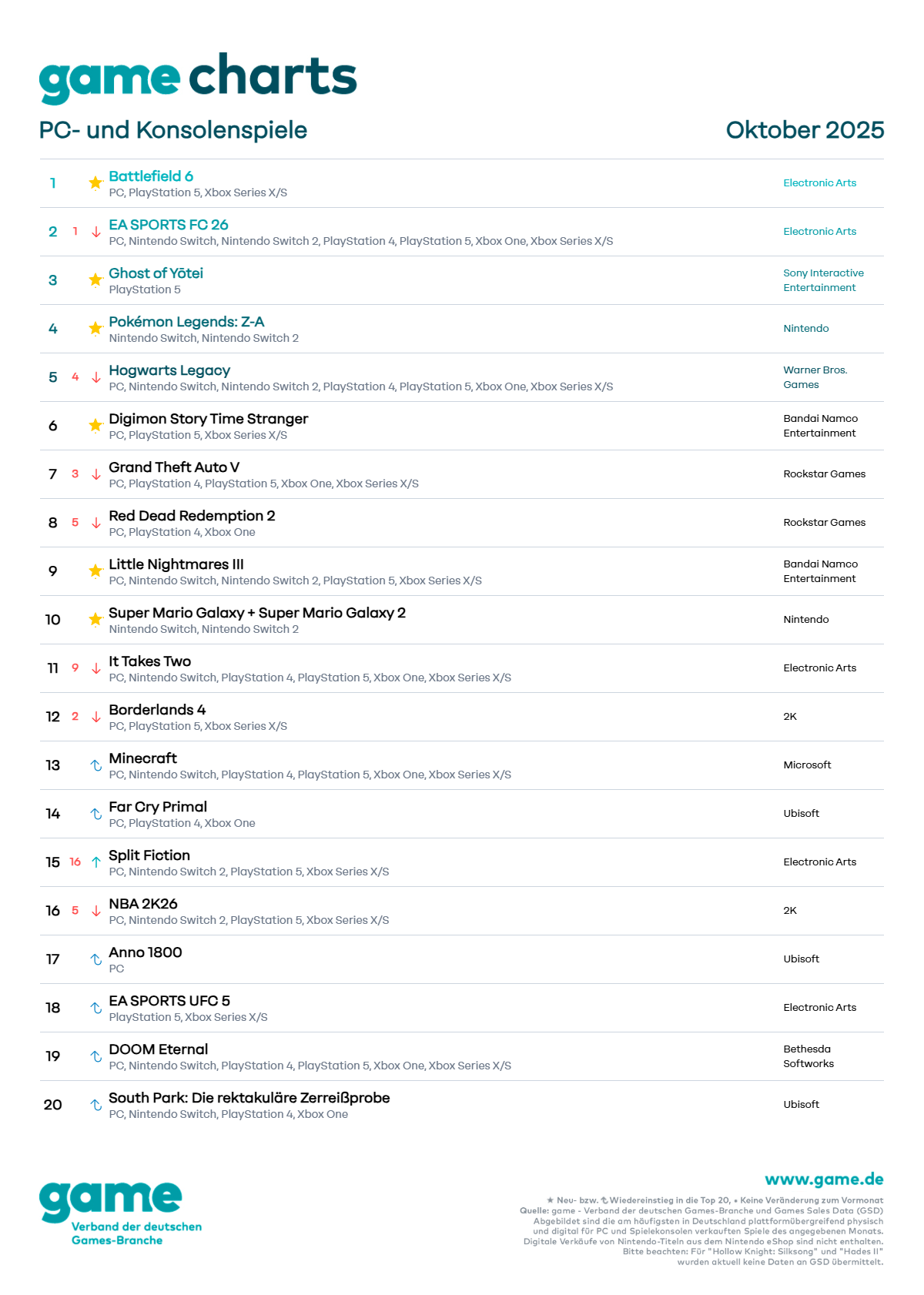 There were multiple new releases in the top 20 with Battlefield 6 debuting in first place.