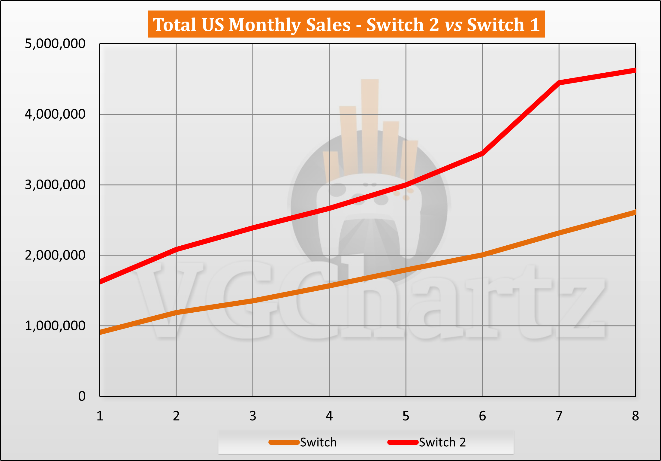 The 8th month for the Switch 2 is January 2026, while for the Switch 1 it is October 2017. The Switch 2 has sold 4.62 million units, while the Switch 1 sold 2.61 million units during the same timeframe.