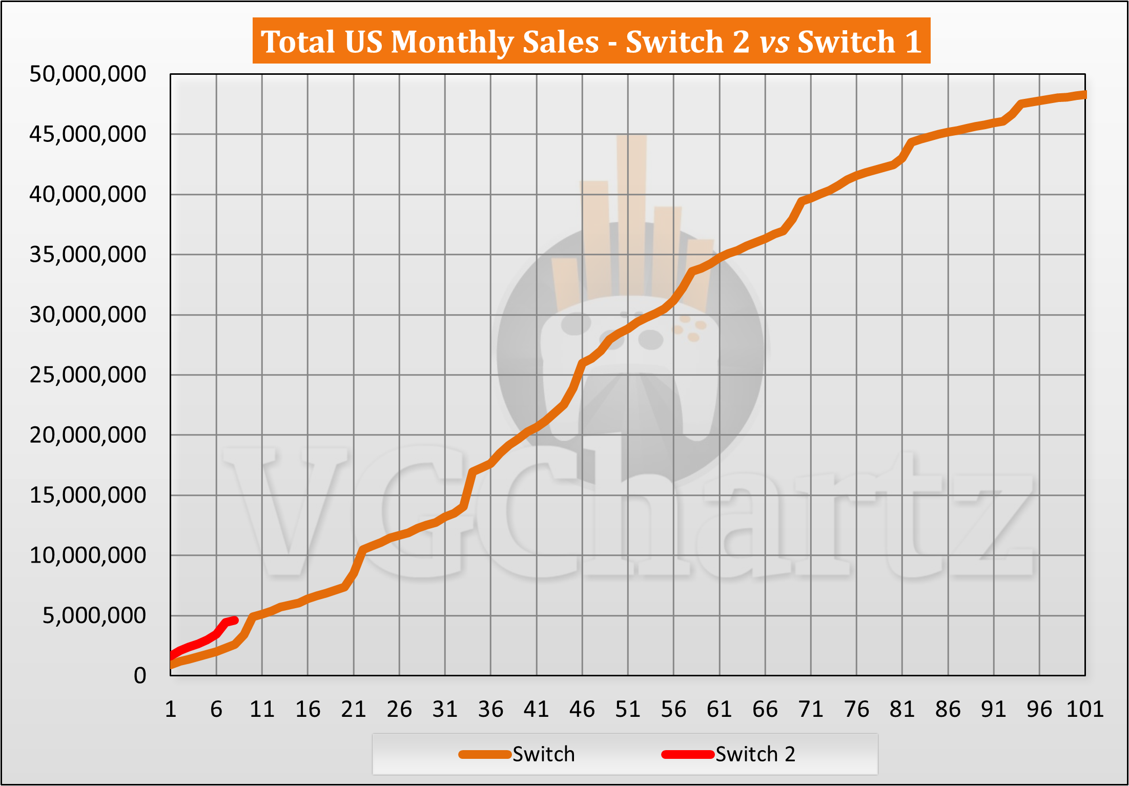 This monthly series compares the aligned US sales of the Nintendo Switch 2 and Nintendo Switch 1.