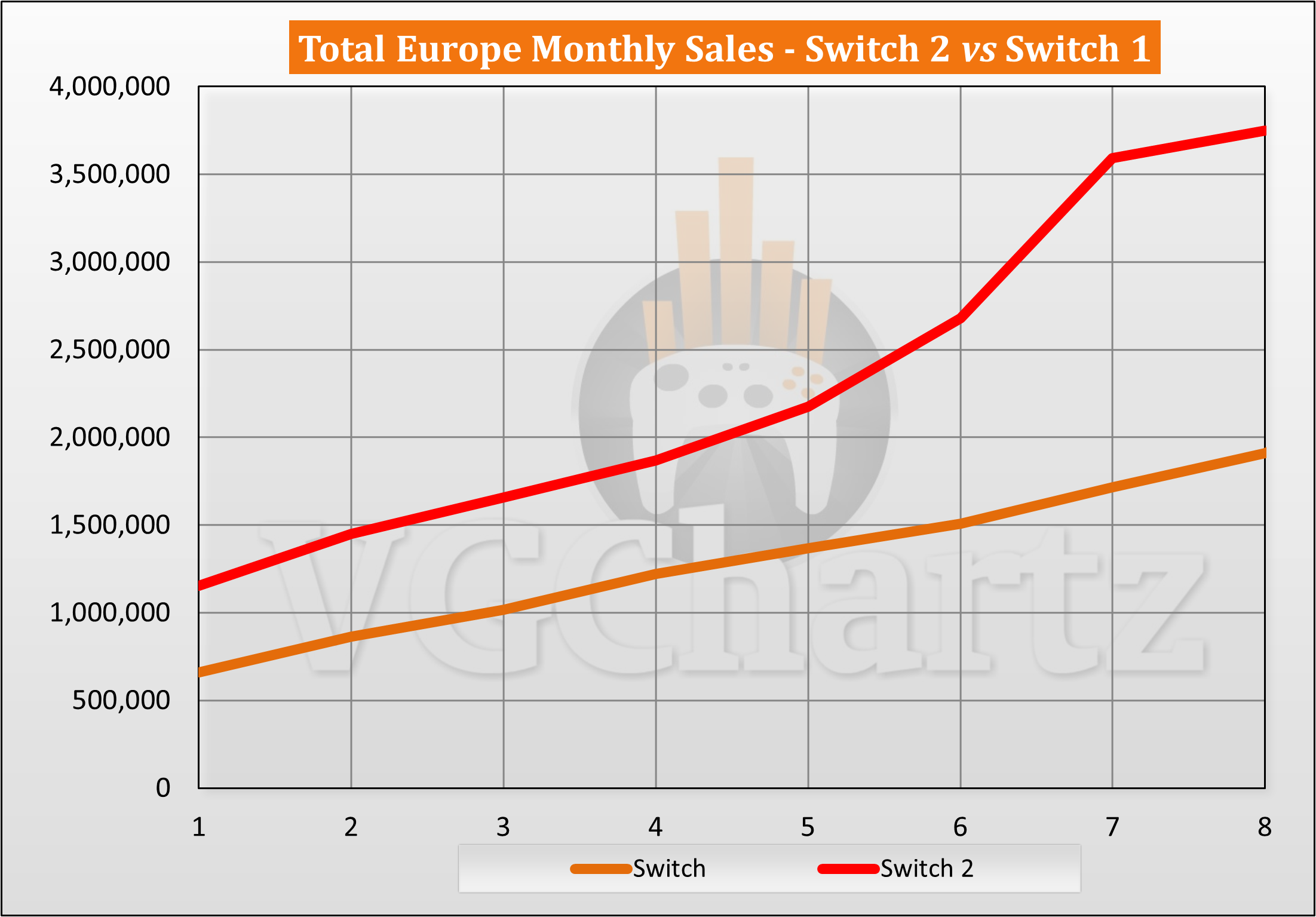 This monthly series compares the aligned Europe sales of the Nintendo Switch 2 and Nintendo Switch 1.