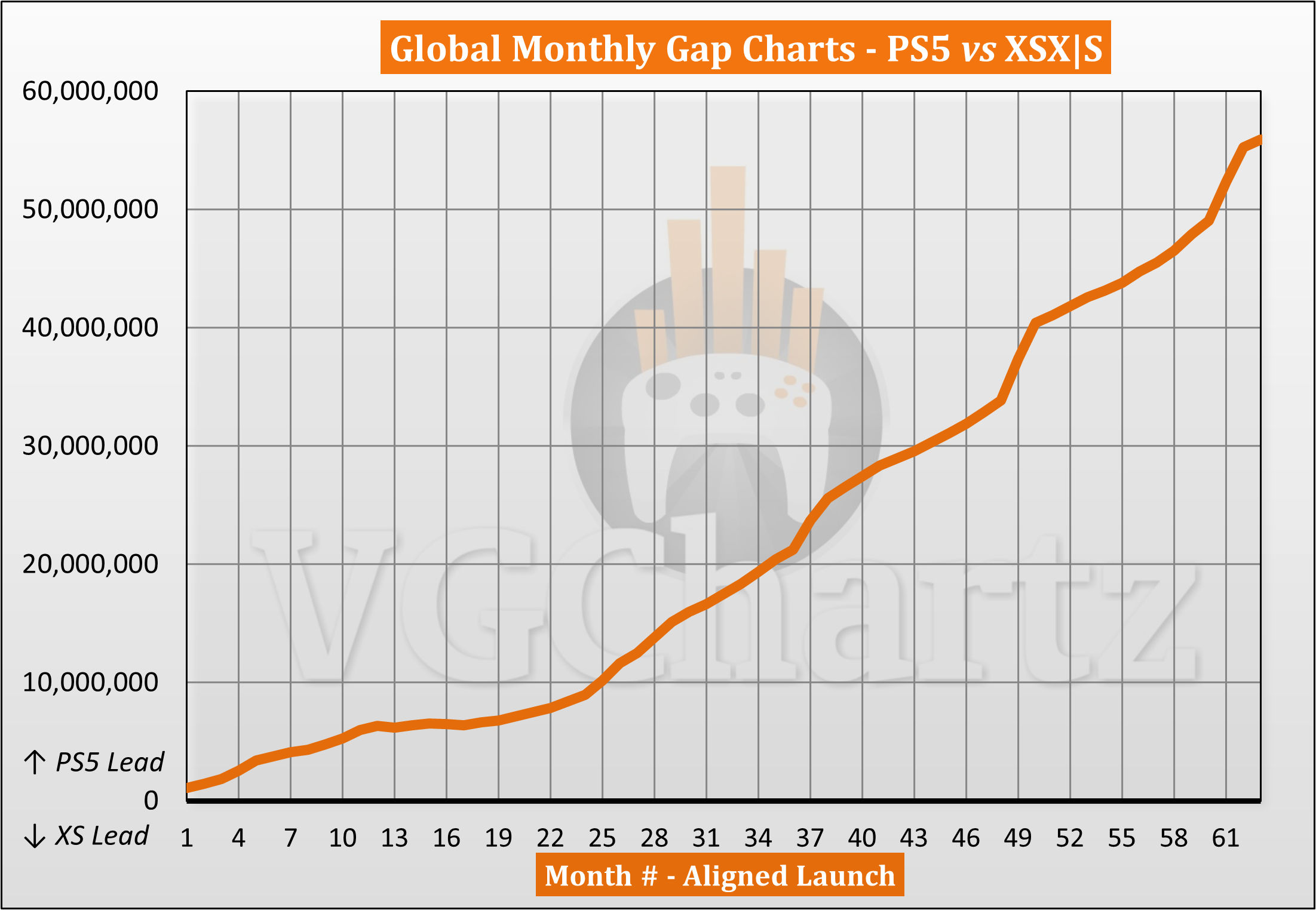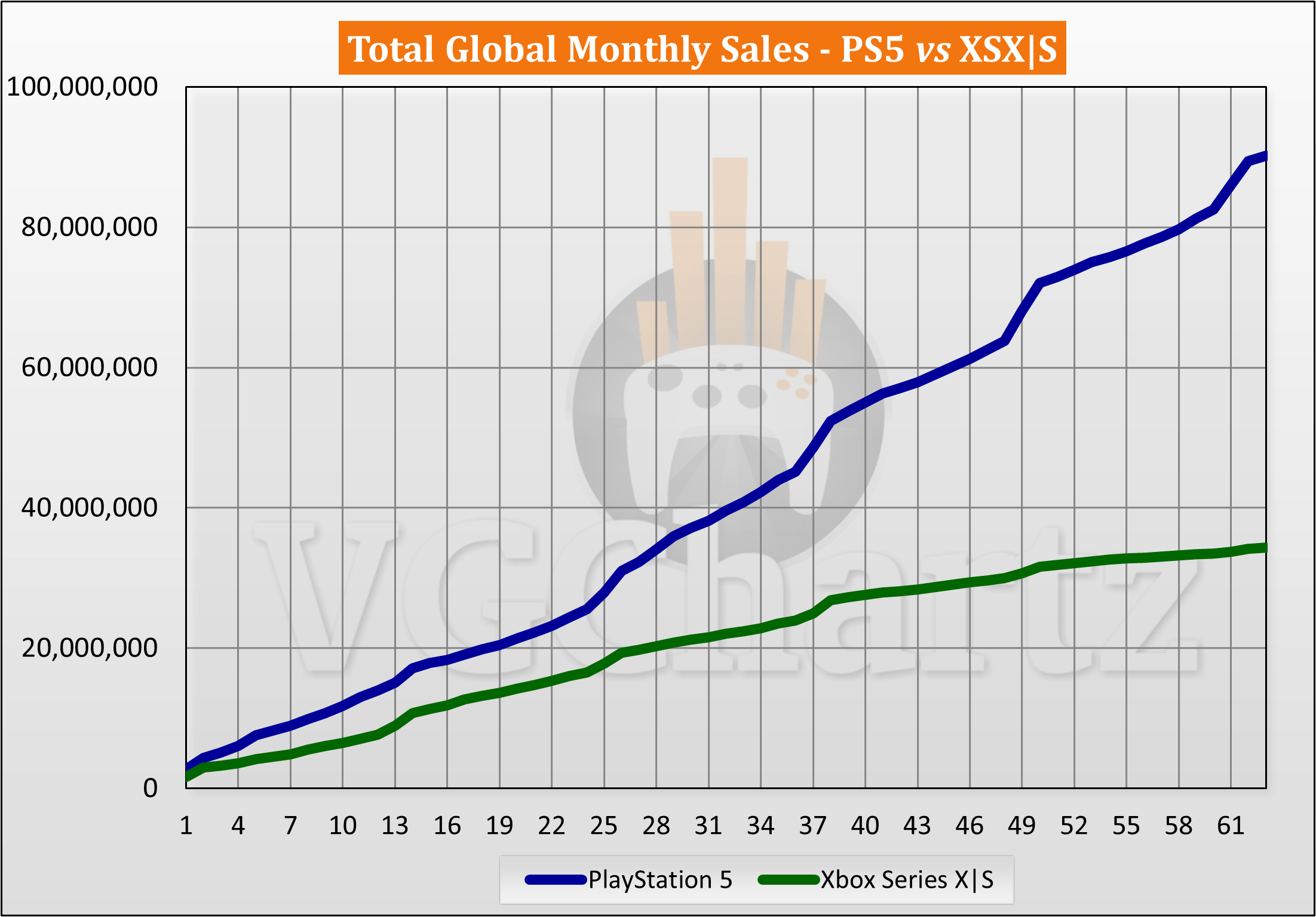 This monthly series compares the aligned worldwide sales of the PlayStation 5 and Xbox Series X|S.