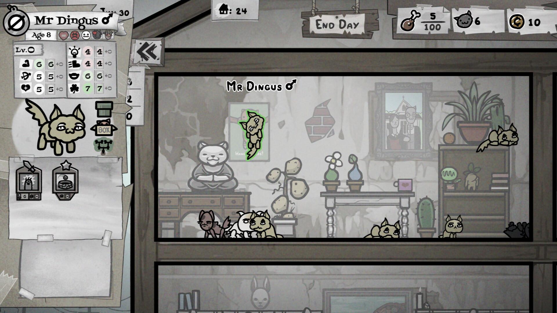 The general game cycle splits between cat management and battles. The management side is a house with cats that you can split up into different rooms. Every day a single stray is available that you can take into your house or leave out in the cold. Once you’re done with a day (there's often not much to do, so these can go quite quickly), your cats eat a certain amount of food from your stockpile and every night there is a chance that your cats will fight or make kittens. While playing from the house, you can visit a few NPCs, who can be upgraded by giving them cats with particular qualities. For instance, one NPC wants only kittens, and they’re a great way to get rid of any undesirables or if you're growing your cat crew more than you can manage. Upgrading these NPCs can improve what's available at different stores, how many items you can keep in storage, or give you access to more information (such as which of your cats are more likely to fight with others).