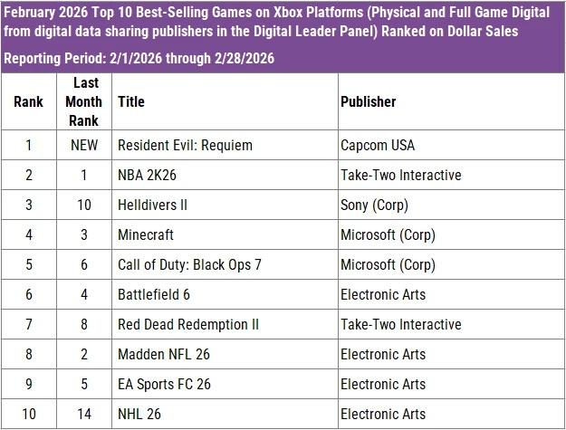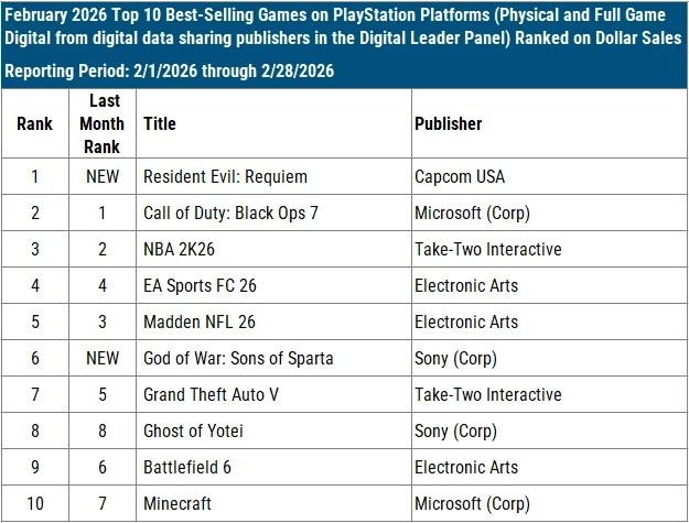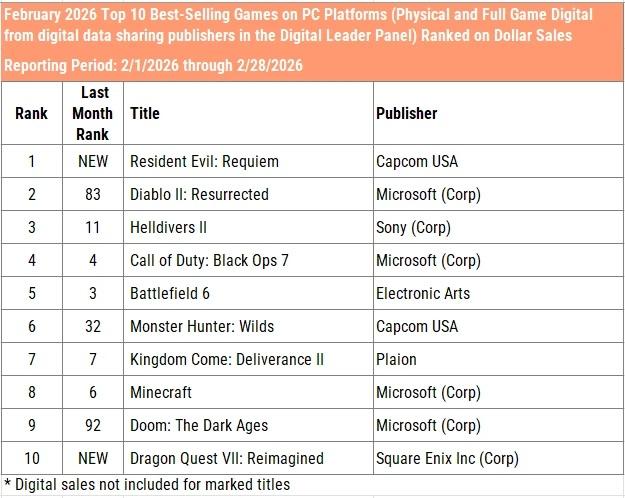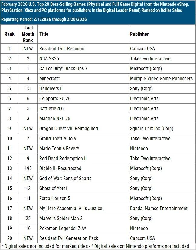 Resident Evil: Requiem debuted in first place in February and is the best-selling game of 2026 after its first month on the market. It was the best-selling game of the month on PlayStation, Xbox, and the aggregated PC storefront charts.