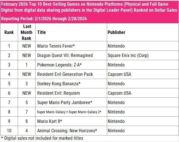 Here are the top 10 best-selling premium games on Nintendo platforms in February 2026: