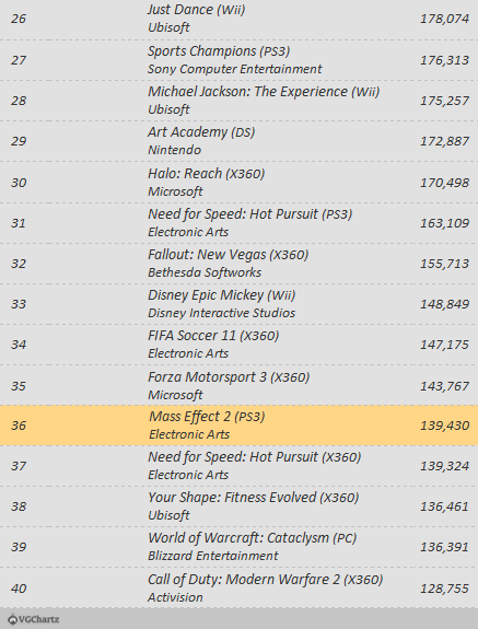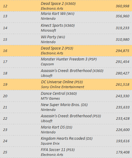 Dead Space 2 comes in at 12 (X360) and 16 (PS3), whilst DC Universe Online manages to pip the 20 at 19. Mass Effect 2 on PS3 dissappoints, barely making it into the top 40, at 36.