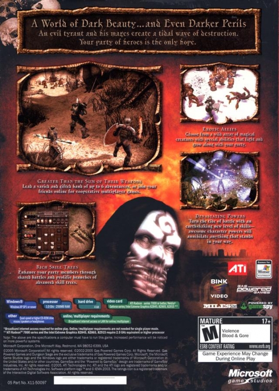 Dungeon Siege II is an action/role-playing game set in a dark, post-apocalyptic fantasy world that concludes the story of Dungeon Siege II. You must hunt down the Dark Wizard in order exact your vengeance and undo the evil brought to the world of Aranna.