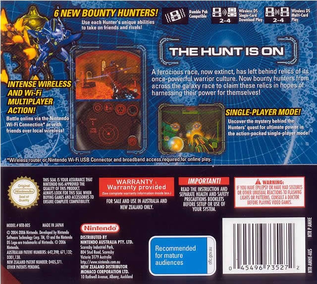 Who is the Galaxy's Most Elite Bounty Hunter? Before Metroid Prime Hunters, the answer was easy. Now that six other ferocious bounty hunters have gathered to challenge Samus, the title is up for grabs. Metroid Prime Hunters delivers the most intense first-person multiplayer action ever experienced on a hand-held system, and with Nintendo Wi-Fi Connection you can test your skills against players from around the world.