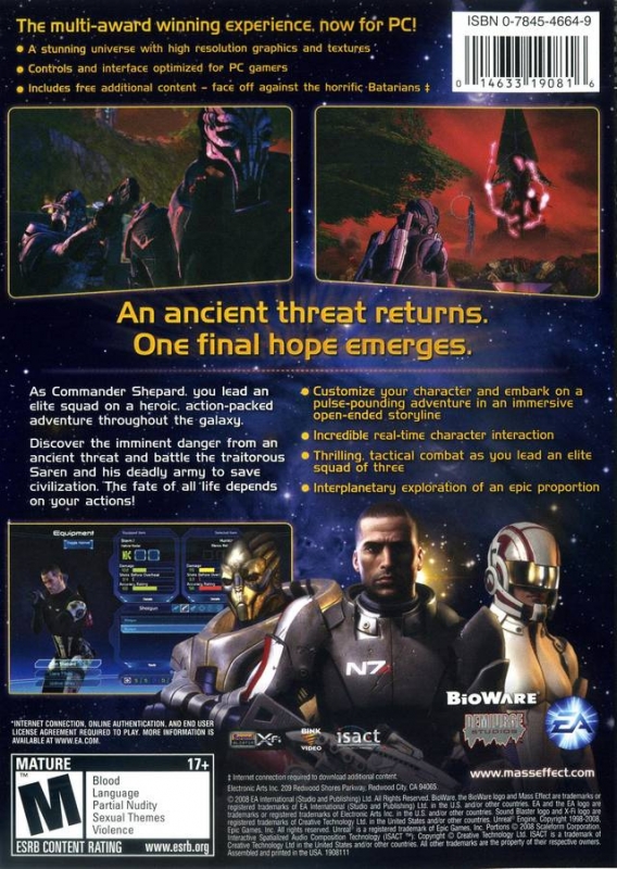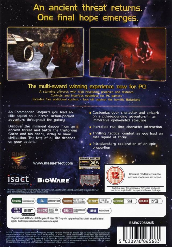 As the first human on the galactic stage, you must uncover the greatest threat to civilization. Your job is complicated by the very fact of your humanity, as no one trusts you and you need to find a way to convince everyone of the grave threat. You will travel across an expansive universe to piece the mystery together. As you discover and explore the uncharted edges of the galaxy, you come closer to an overwhelming truth - learning that the placid and serene universe you know is about to come to a violent end and that you may be the only person who can stop it! In addition to the main story arc of the game, players are be able to visit a large number of uncharted, unexplored planets which are side quests independent from the main story. At any time during the campaign, a player can choose to explore one of these planets and have an opportunity to discover new alien life, resources, ruined civilizations and powerful technologies. Talents and abilities are upgradeable and advanced talent options become available at higher levels. Weapons and vehicles are customizable to include various effects, abilities and upgrades using the "X-Mod" system. Each character class have unique talents and abilities which increase in power as the player progresses through the game. Optimized controls have been designed specifically for the PC. Fully customizable controls â PC gamers can re-map the control scheme any way they like. Run & Gun Control â Players can assign biotic powers or skills to âhot keysâ allowing them to play Mass Effect with a heavier focus on action. New decryption mini-game. New inventory screen GUI and functionality â The enhanced inventory system makes it easier for players to equip and modify their weapons and armor.