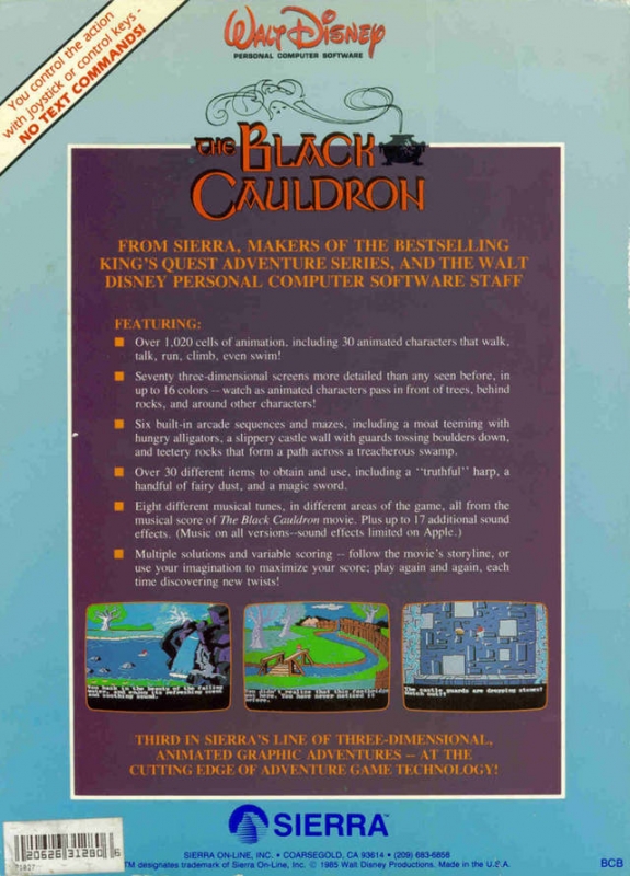 The Black Cauldron is a side-view adventure game. Players control Taran and can make him walk, run, swim and interact with other characters in the game. Puzzle-solving and advancement in the plot requires item manipulation of using the right item at the right time or at the right location.