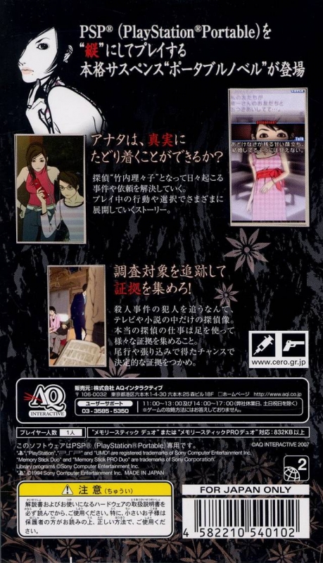 Anata o Yurusanai is an Adventure game, developed by Zener Works and published by AQ Interactive, which was released in Japan in 2007.