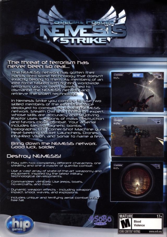 The NEMESIS network has gotten their hands onto some technology that doesn't exactly belong to them. As members of an elite force tasked with fighting worldwide terrorism, you've been summoned to dismantle the NEMESIS network and retrieve the stolen technology. In Nemesis Strike you combine to use two skilled members of the elite strike force deployed to combat the deadly NEMESIS network. Stealth Owl is an infiltration expert, whose skills are accuracy and skydiving. Raptor uses weapons of mass destruction and favors close combat. Your arsenal includes Electromagnetic bombs, Holographs, LCD Corner-Shot Machine guns, Heat-Seeking Rocket Launchers, Drones, Infra-Red Vision, and Sonar to name a few... Bring down the NEMESIS network Good luck soldier. Destroy NEMESIS! Play with two completely different characters: one stealthy and one a master of guerrilla combat.