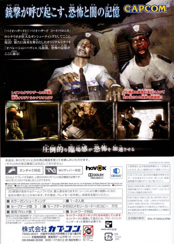 Resident Evil: The Darkside Chronicles‘s story is based on Resident Evil 2 and includes the popular characters, Leon S Kenney and Claire Redfield. Its on-rails style gameplay and active camera will create a more immersive "Chronicles" survival experience. As in the last installment, this is a first-person game with extreme shooting gameplay and interactive pathways. Filling in many of the missing pieces of storyline that were not covered in the original Umbrella Chronicles, Resident Evil: The Darkside Chronicles will give hardcore fans the chance to re-live some of the most classic moments of the Resident Evil franchise, while allowing new players to take advantage of the intense action-horror experience only possible on the Wii.