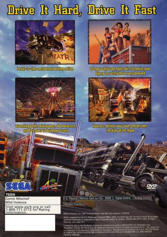 Drive it hard and drive it fast with The King of Route 66 for PlayStation® 2 computer entertainment system. Prepare to climb inside the cab of a nitro-powered 18-wheeler and haul ass from Illinois to California in a mad dash for cash. But this big rig road trip isn't your ordinary out and back. The sinister Tornado Corporation has sent a rogues gallery of truck-ramming goons to keep you from succeeding. Upgrade your truck with more than 70 insane performance-enhancing parts to smoke the competition. But don't forget to stop and smell the flowers, because along the way you'll have the chance to win the hearts of eight scandalous interstate beauties known as the Queens of Route 66. These friendly gals are among more than three-dozen characters you'll encounter, each with their own story to tell.