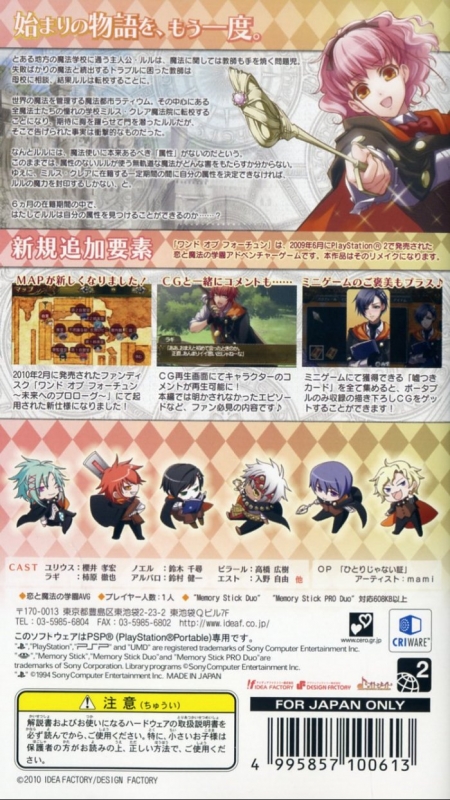 Wand of Fortune Portable is an Adventure game, developed and published by Idea Factory, which was released in Japan in 2010.