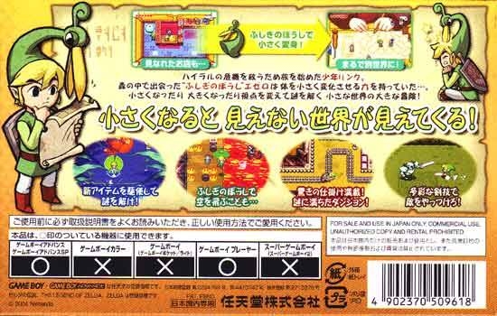 Link returns in an all-new Game Boy Advance adventure! As he searches an unfamiliar land for fragmented relics called Kinstones, Link will have to take a closer look at the ground beneath his feet. Using the power of a mystical hat called The Minish Cap, the Hylian hero will shrink down for a massive quest... on a microscopic scale! The Kinstones have been cracked into fragments and spread across the world, and only by fusing them together can you solve puzzles and unlock secrets. Talk to everyone you meet, or link with friends and fuse Kinstones with them. Link will have his work cut out for him as he fights evil in his own land then shrinks to help the Minish people, a miniature race in dire need of a hero. As you wander a vast overworld, slash your way through hordes of enemies, explore puzzling dungeons and use new items like a suction device that can fire out what it absorbs.
