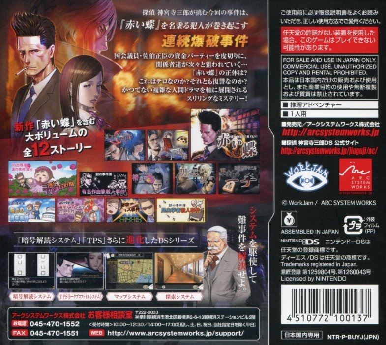 Jinguuji Saburou DS: Akai Chou is an Adventure game, developed by WorkJam and published by Arc System Works, which was released in Japan in 2010.