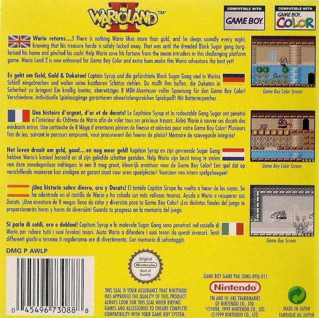There is nothing Wario likes more than gold, and he sleeps soundly every night, knowing that his treasure horde is safely locked away. That was until the dreaded Black Sugar gang burglarised his home and pinched his cash! Help Wario save his fortune from the mean intruders in this challenging platform game. Wario Land 2 is now enhanced for Game Boy Color and extra hues make this Wario adventure the best yet!