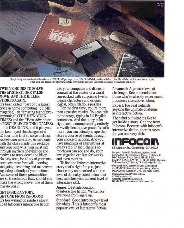 It's DEADLINE, and it pits you, the keen-eyed sleuth, against a 12-hour time limit to solve a classic locked-door mystery. Armed only with the clues inside this package and your own wits, you must sift through myriads of evidence and motives to track down the killer. No easy feat, for all six of your suspects exercise free will -- coming and going, scheming and maneuvering independently of your actions. And some of these personalities are so treacherous that, should you make the wrong move, one of them may do you in.