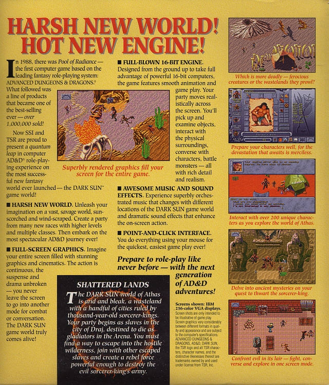 Now SSI and TSR and proud to present a quarntum leap in computer AD&D® role-playing experience on the most successful new fantasy world ever launched -- the DARK SUN™ game world!