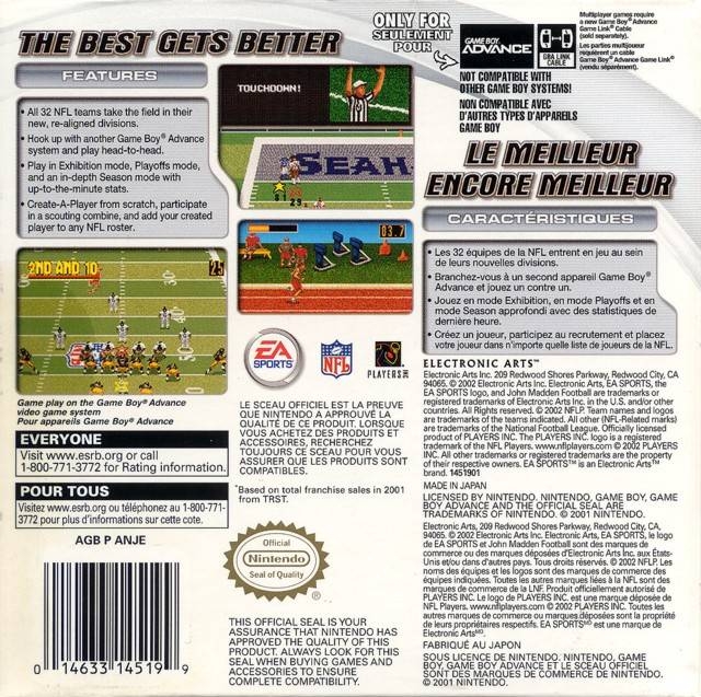 Enjoy the excitement of the 2002 NFL football season in Madden NFL 2003. Madden NFL 2003 allows you to control every in-depth aspect of the game, take head-to-head competition to the next level, experience an interactive audio environment, and see and use new animations that help change the way you play the game. Utilize new game modes that help develop critical football related skills, and unlock hidden teams and extra cheat tips to broaden your gaming experience.