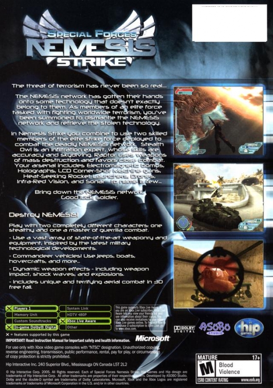 Join the fight against global counterterrorism. In Nemesis Strike, you'll guide a team of two agents--Stealth Owl and Raptor--as they cross into enemy territory. Stealth Owl is an infiltration expert with skills in accuracy and skydiving, while Raptor favors powerful weapons and close combat. Among your arsenal are electromagnetic bombs, holographic gadgets, heat-seeking rocket launchers, and sonar vision. Use jeeps, boats, hovercrafts, and aircraft to travel around the fully destructible environments.