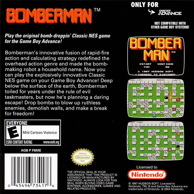 The game that spawned more than 15 others, Bomberman, returns to the Game Boy Advance with its unique combination of action and puzzle-solving. As the title character, you must blow up bricks and enemies on the battlefield in an effort to find the door to the next level. In each stage, you'll find power-ups that extend your blast radius. However, if you're caught in your own bomb blast, you must start the level over.